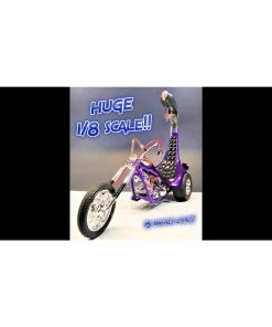 1/8 Scale. Molded in Metallic Purple, 2 huge sprues of chrome parts, clear sprue, red and clear tubing and big rubber tires for the back and front. The build up was done straight out of the box with only glosscoat, black & white paint used. Used tan and a mix for the Condors neck. Carefully read through the instructions and check off each step as you go along. The decal sheet has also been updated. Take your time and use a quality glue with a precision applicator.Â