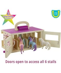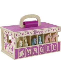 Breyer Farms Unicorn Magic Wooden Stable with carry handle – The Unicorn Magic Wooden Stable Playset comes complete with 6 Stablemates unicorns. Designed to be easy for small hands to carry, the wooden stable with carry handle makes the perfect take-along toy!