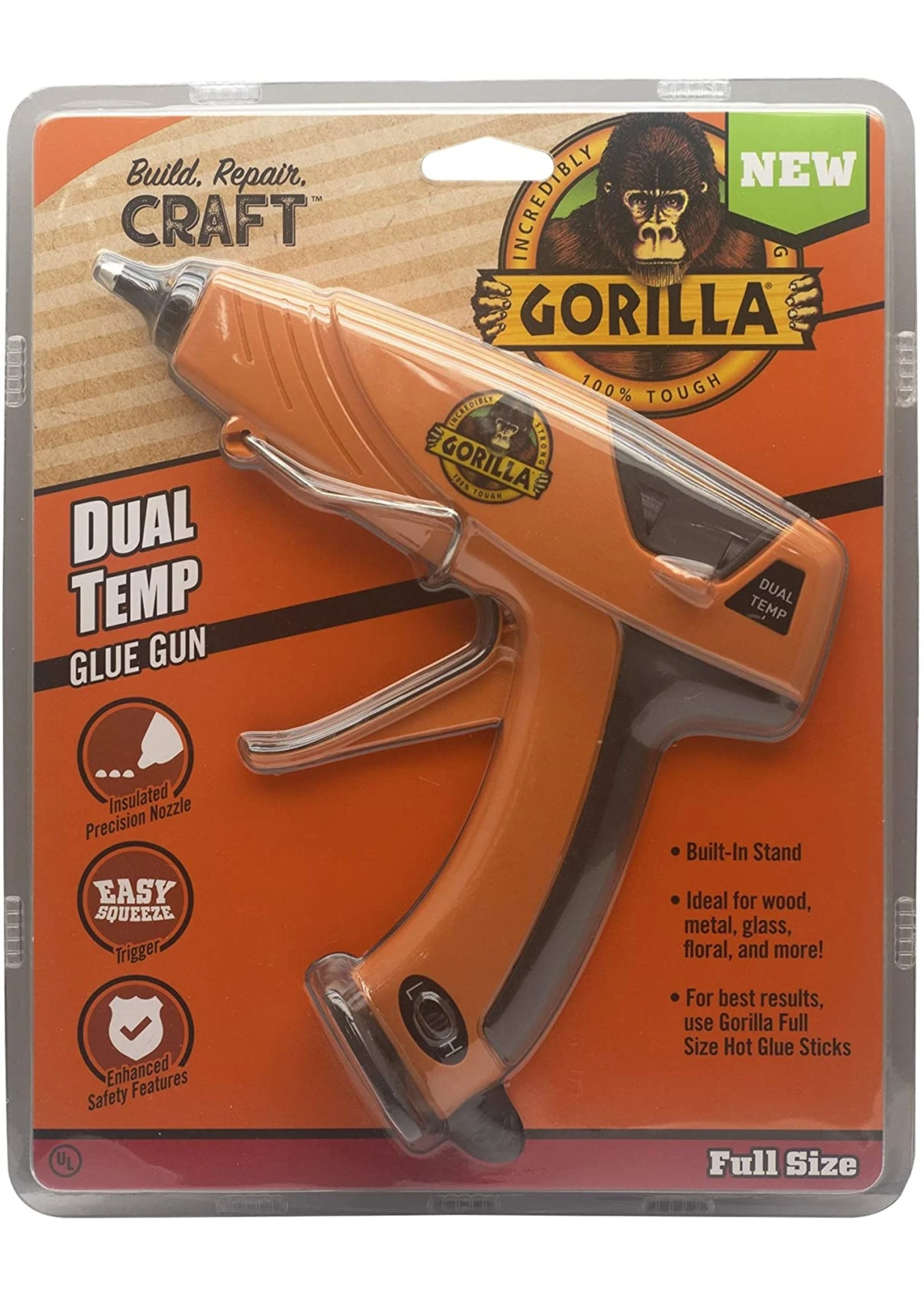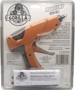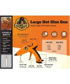 The Gorilla Dual Temp Full-Size Glue Gun is an ideal tool for crafts and home projects requiring more glue output and volume. It is light weight, with a comfort grip and a built-in stand making it easy to use. The easy squeeze trigger and long insulated nozzle allow a precise application on any project. Click on the Gorilla link at the top of the page to see more Gorilla tough products.