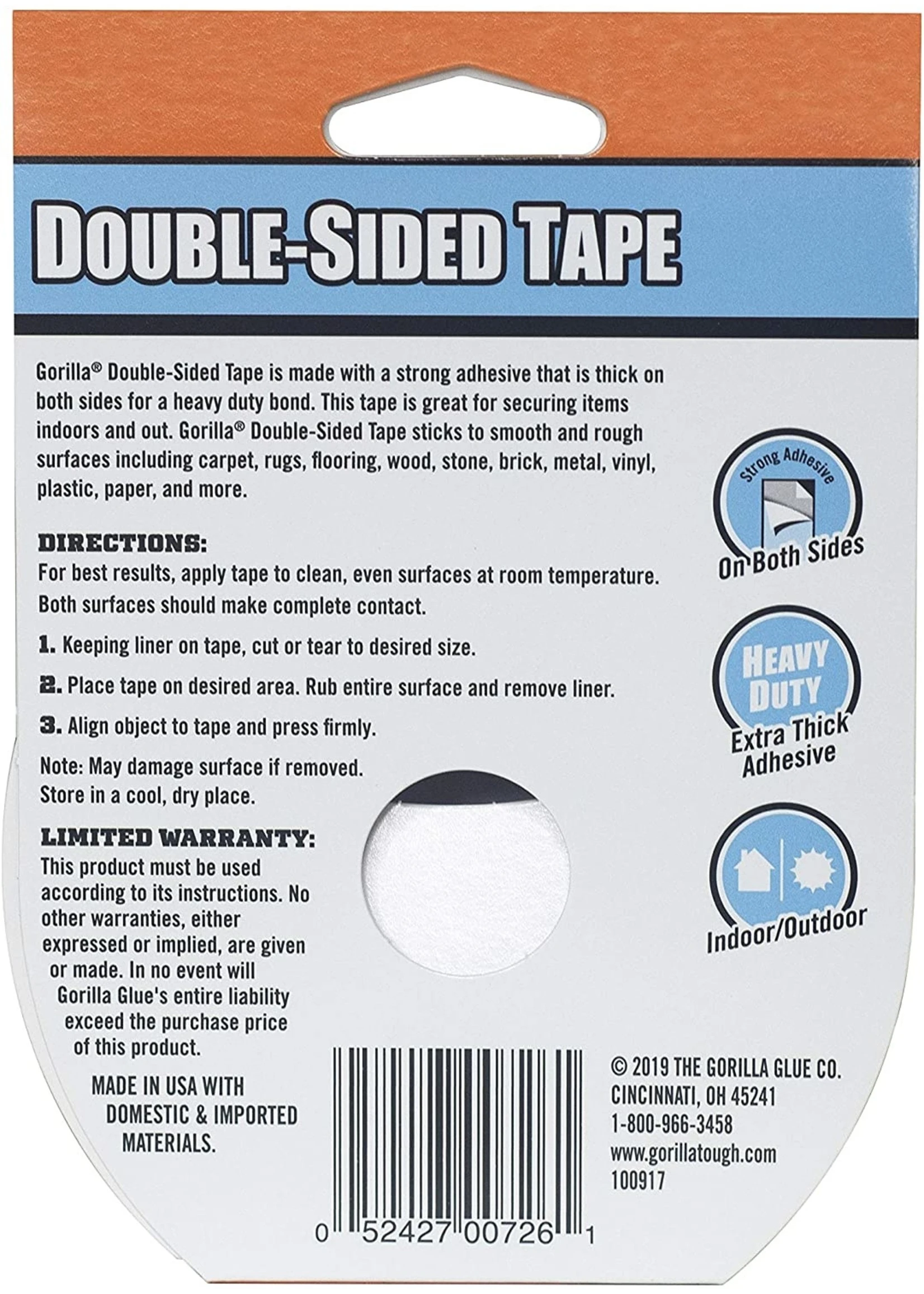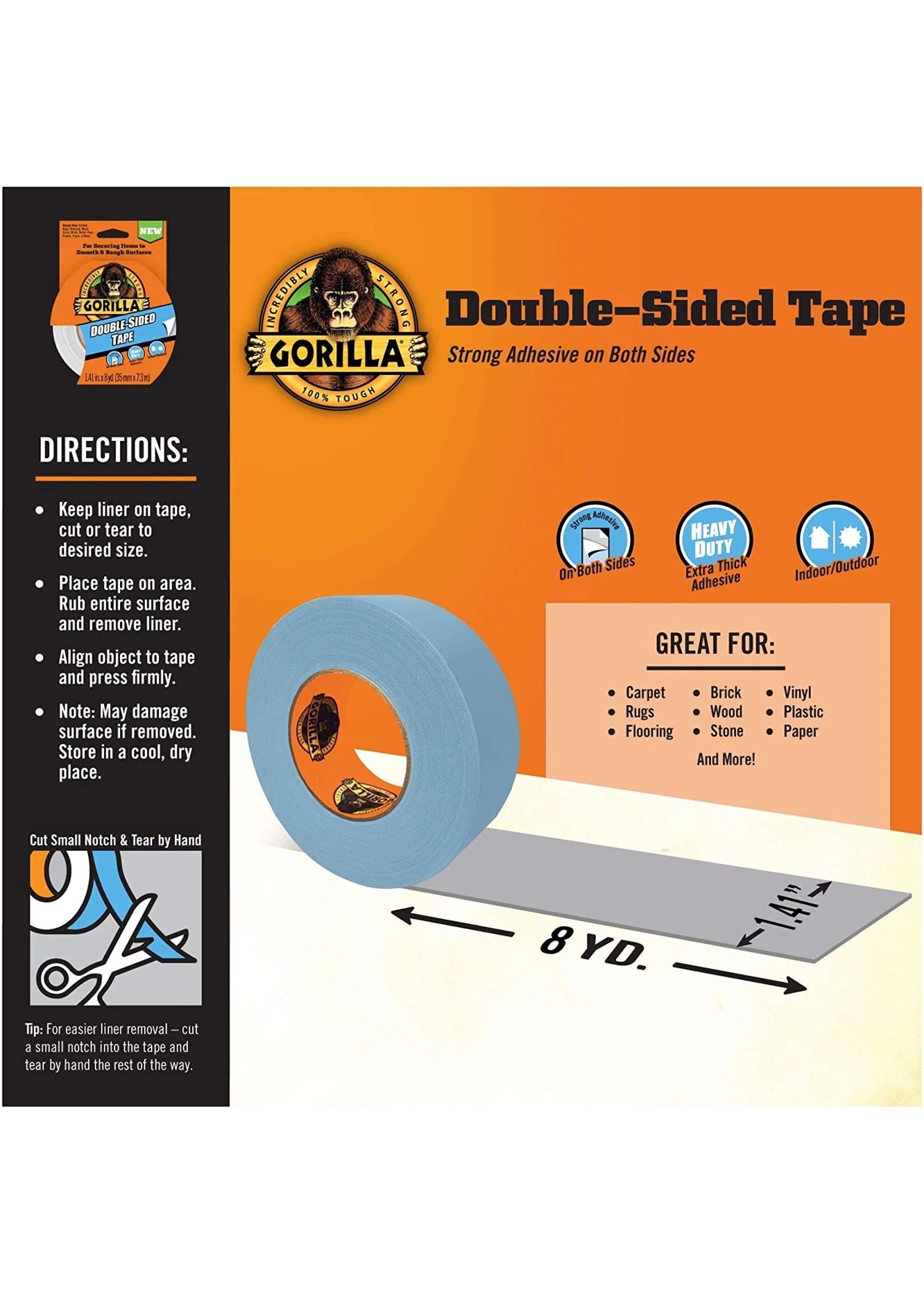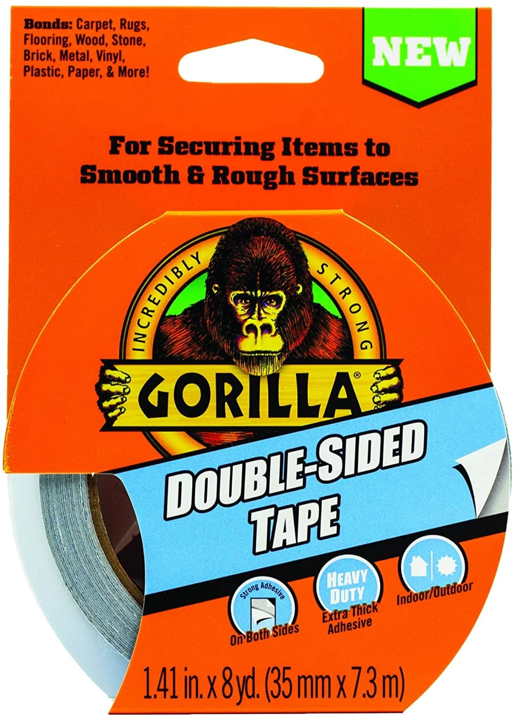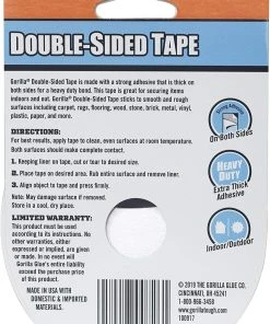 Gorilla Double-Sided Tape is made with a strong adhesive that is thick on both sides for a heavy duty bond. This tape is great for securing items indoors and out. Gorilla Double-Sided Tape sticks to smooth and rough surfaces including carpet, rugs, flooring, wood, stone, brick, metal, vinyl, plastic, paper, and more. Do not use to hang heavy-duty items. Click the Gorilla link at the top of the page to see more great products from Gorilla.