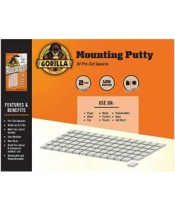 Gorilla Mounting Putty is ideal for hanging light weight items in place of traditional tapes, push pins, and fasteners. Squares are non-toxic, reposition-able, and long lasting. Great for use indoors and temporary outdoor use. Use on paper, painted walls, wood, tile, metal, posters, plastic, glass, and more! Click the Gorilla link at the top of this page to see more great products from Gorilla.