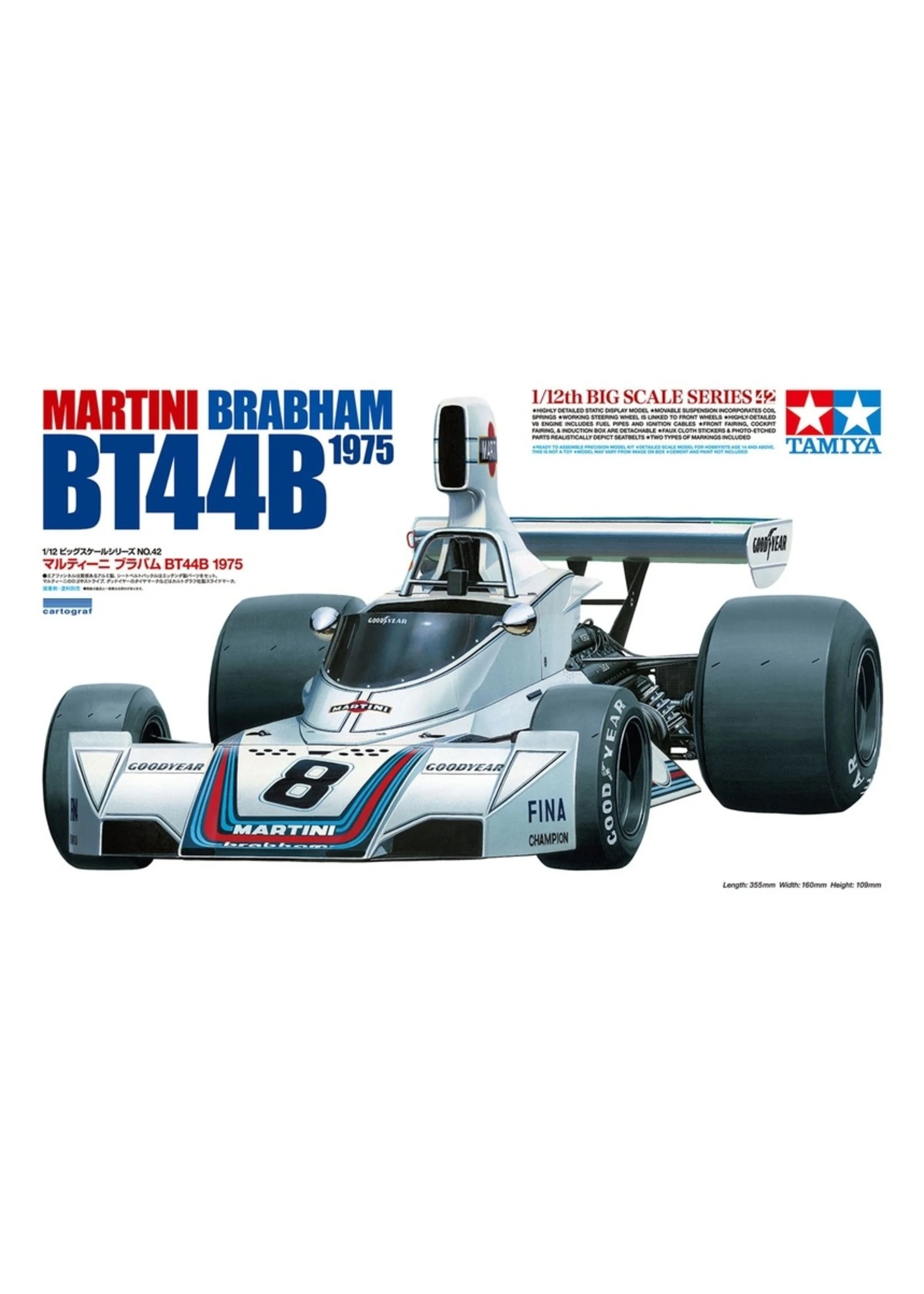 - 1/12 scale plastic assembly kit of the Martini Brabham BT44B 1975. Length: 355mm, width: 160mm, height: 109mm.