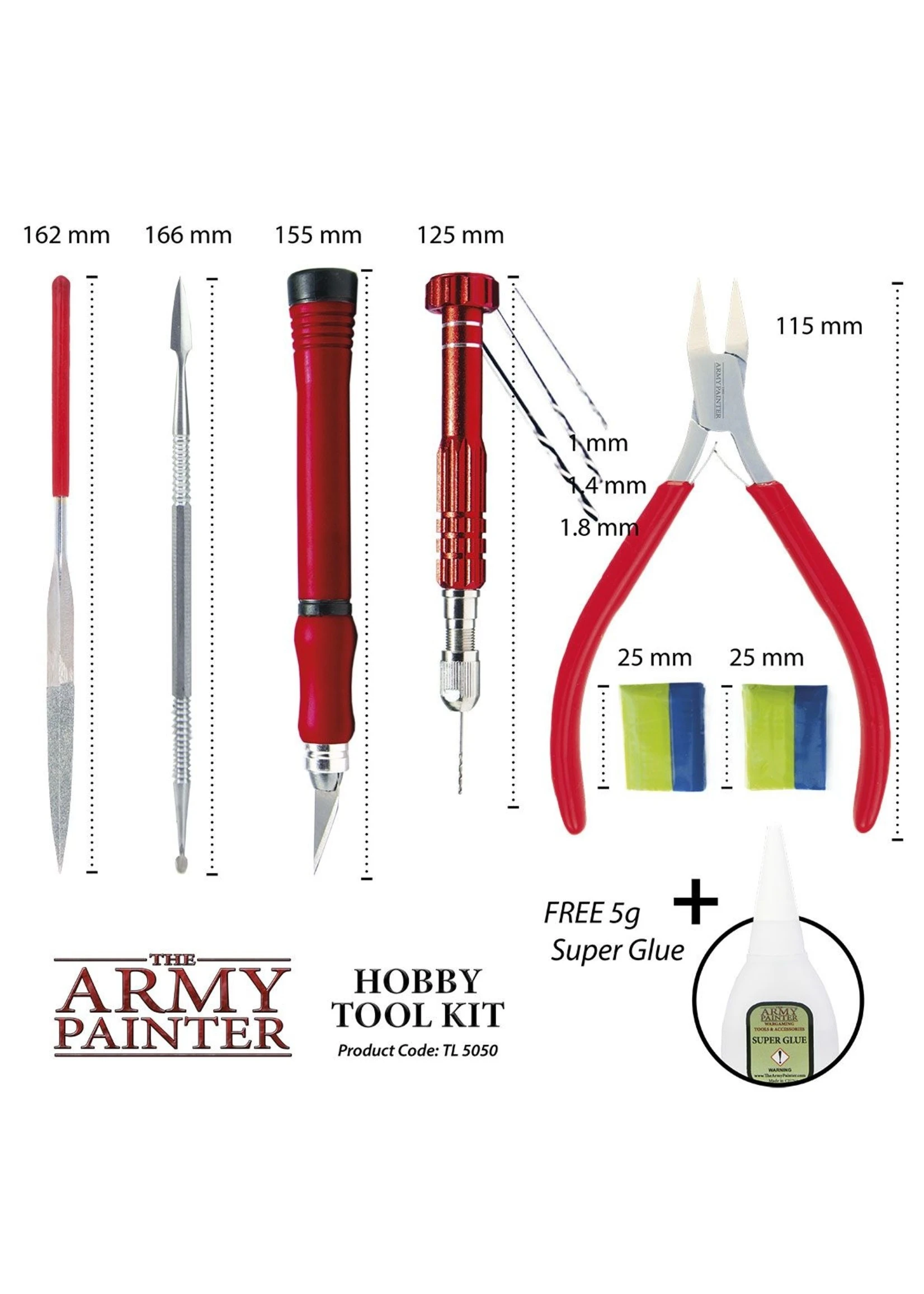 This amazing set has been designed to give the wargamer a “one box fits all” tool kit. Includes all the basic tools you need to assemble any miniatures army. It also includes a free 5g Super Glue as well as a guide to tool safety and the Army Painter Technique Painting Guide.